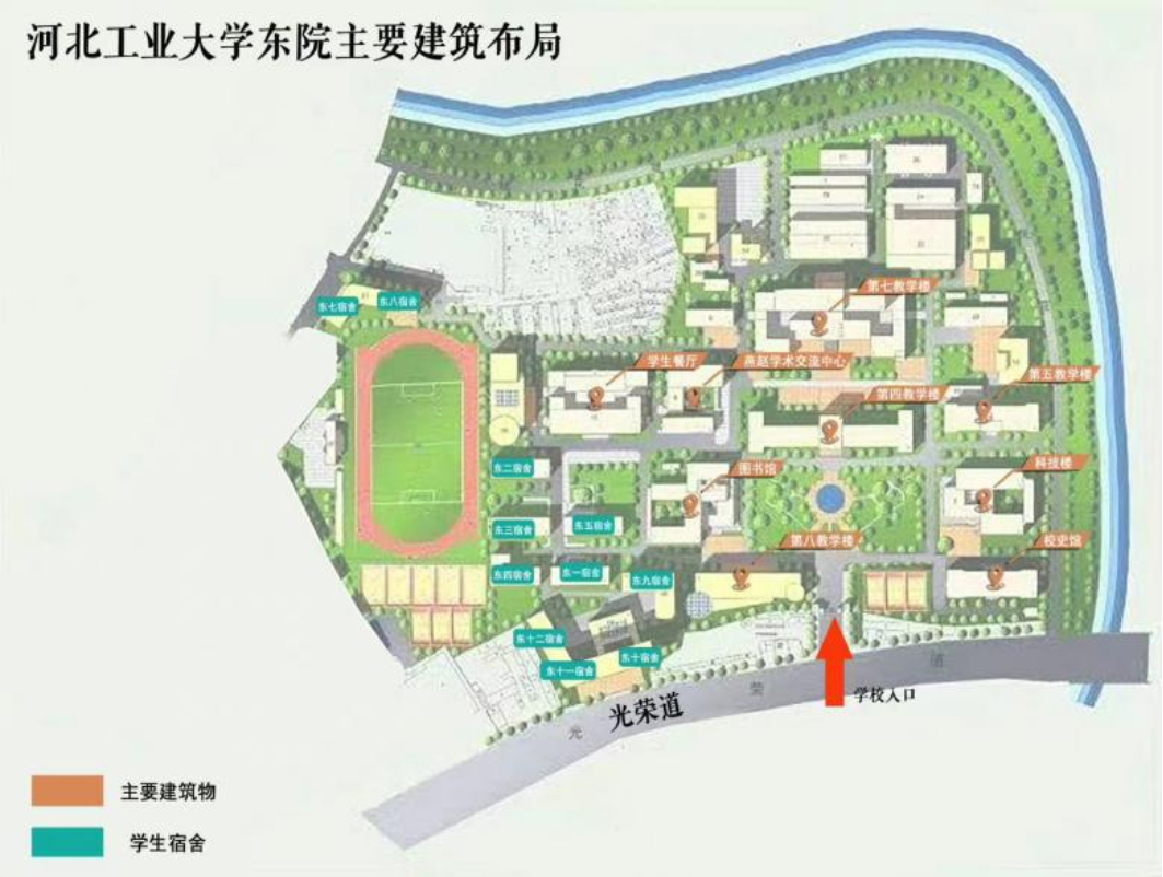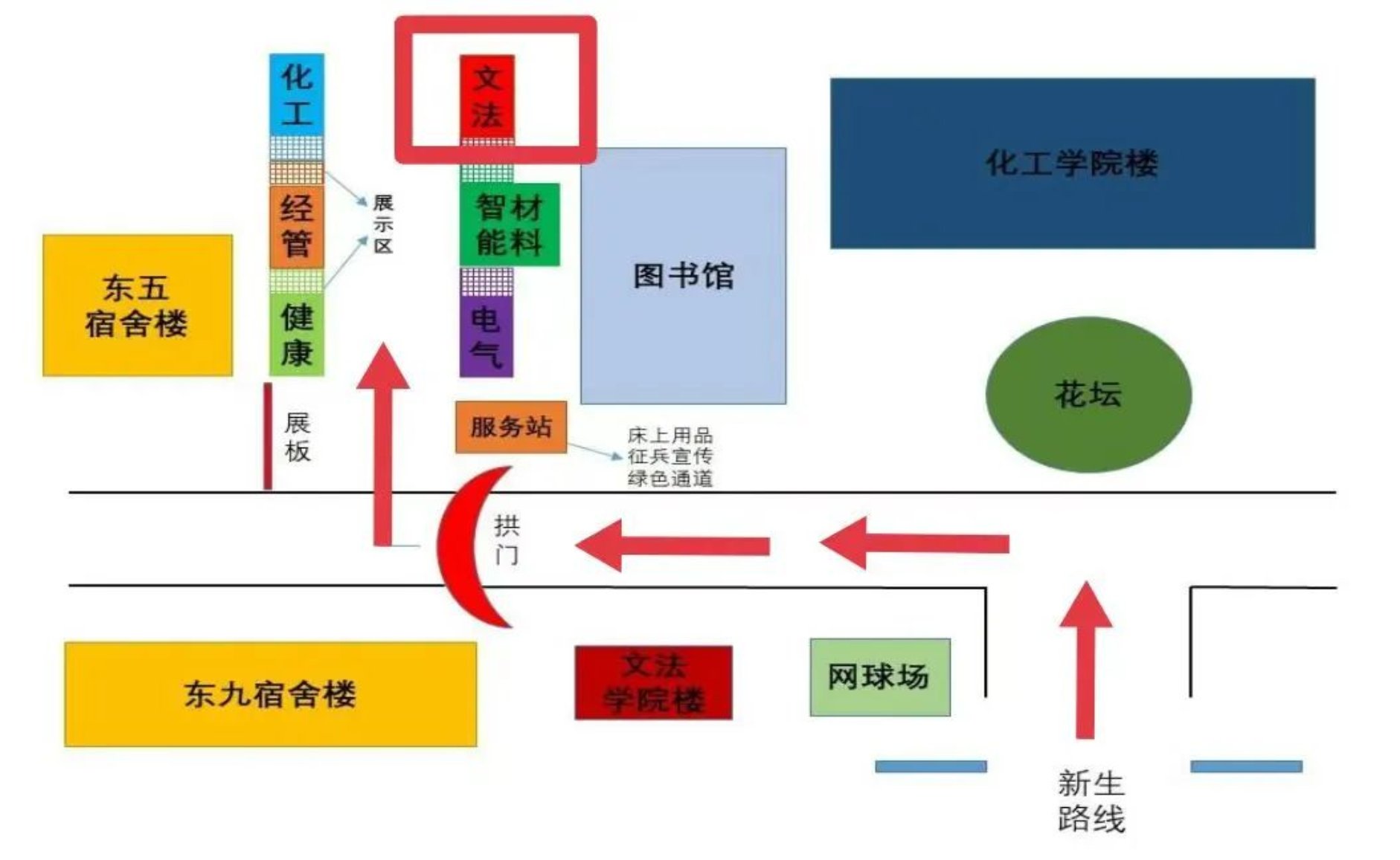 新生们进入东院校门口后,向左方向拐弯直走便可看到图书馆,随后到达位于图书馆西侧的报道点。新生女生宿舍是东二宿舍,新生男生宿舍是东三宿舍。报到路线图和熟女 东院主要建筑布局图如下所示。