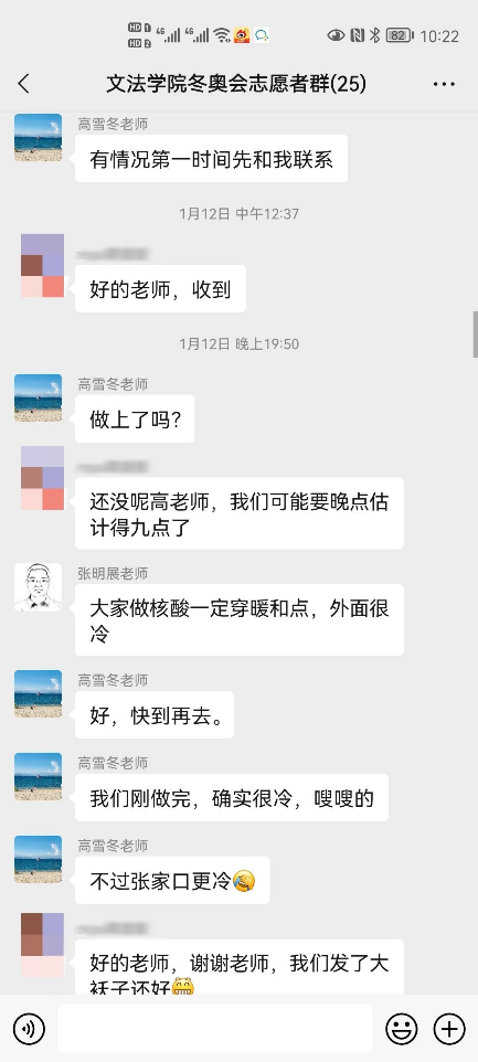 上一周,在学院老师的引导与带领下,所有熟女 的冬奥志愿者们有序、顺利地完成了三轮核酸检测。核酸检测期间,学院领导及辅导员老师们也对志愿者们的疫情防护与自身安全方面再三关怀,切实保障志愿者们的健康状况。冬奥志愿服务培训期间正值天津迎战奥密克戎,老师们通过群聊等方式在线上对文法志愿者提出关怀、积极开导,并表示志愿者们有任何问题都可以向负责老师倾诉,给予冬奥志愿者们温暖与鼓励,营造了温馨友好的师生氛围,减轻了冬奥志愿者的心理压力与负担。