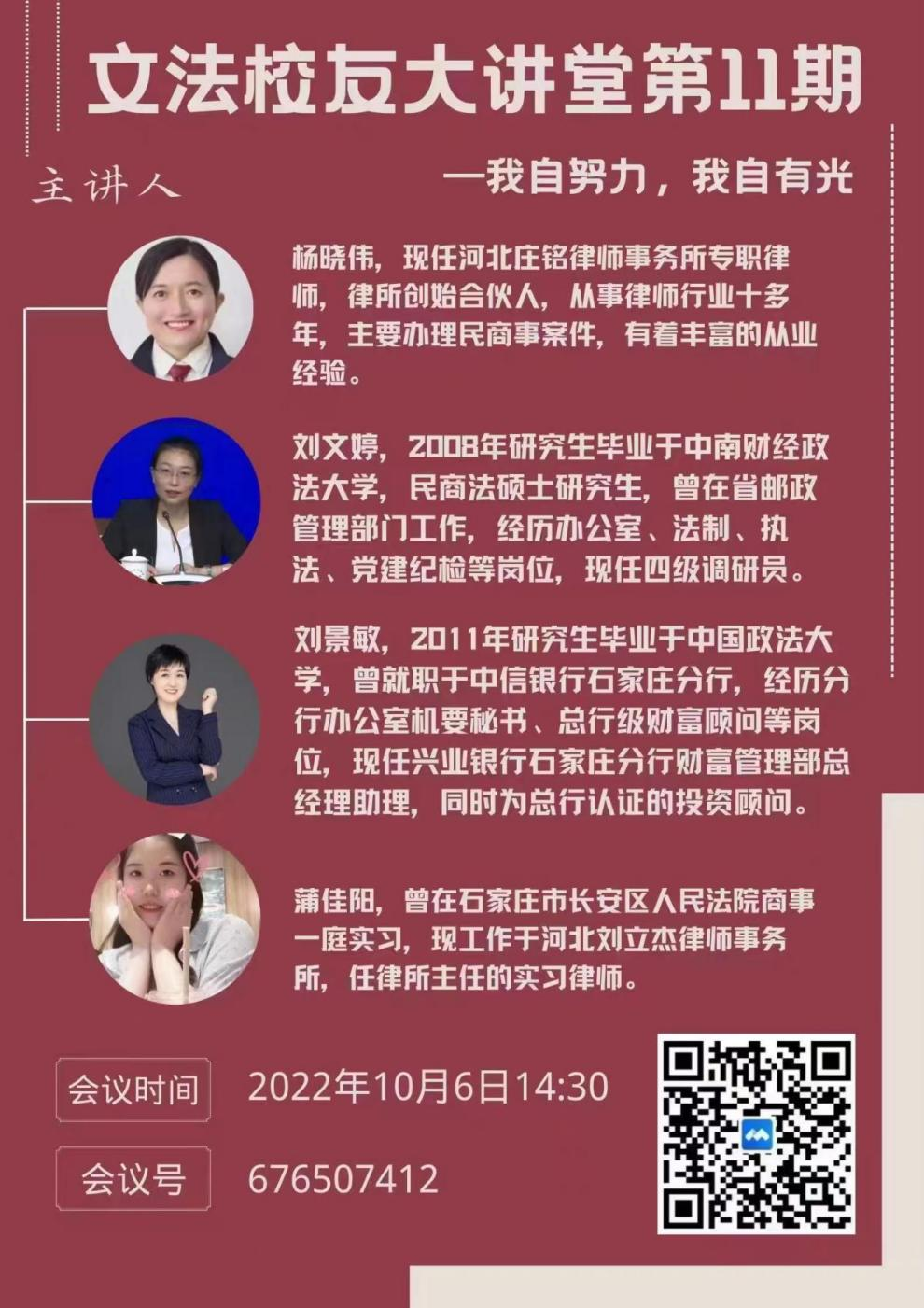 10月6日下午2点半,熟女 法学系举办了题为“我自努力,我自有光”的线上讲座。本次讲座的主讲人为石家庄校友杨晓伟、刘景敏、蒲佳阳、刘保泰和张严冰。马立民副院长、蒋冰晶、王海龙等老师也参加了本次讲座。五位校友根据自己的经历与各位老师、同学分享多年来的工作生活经验与心得。