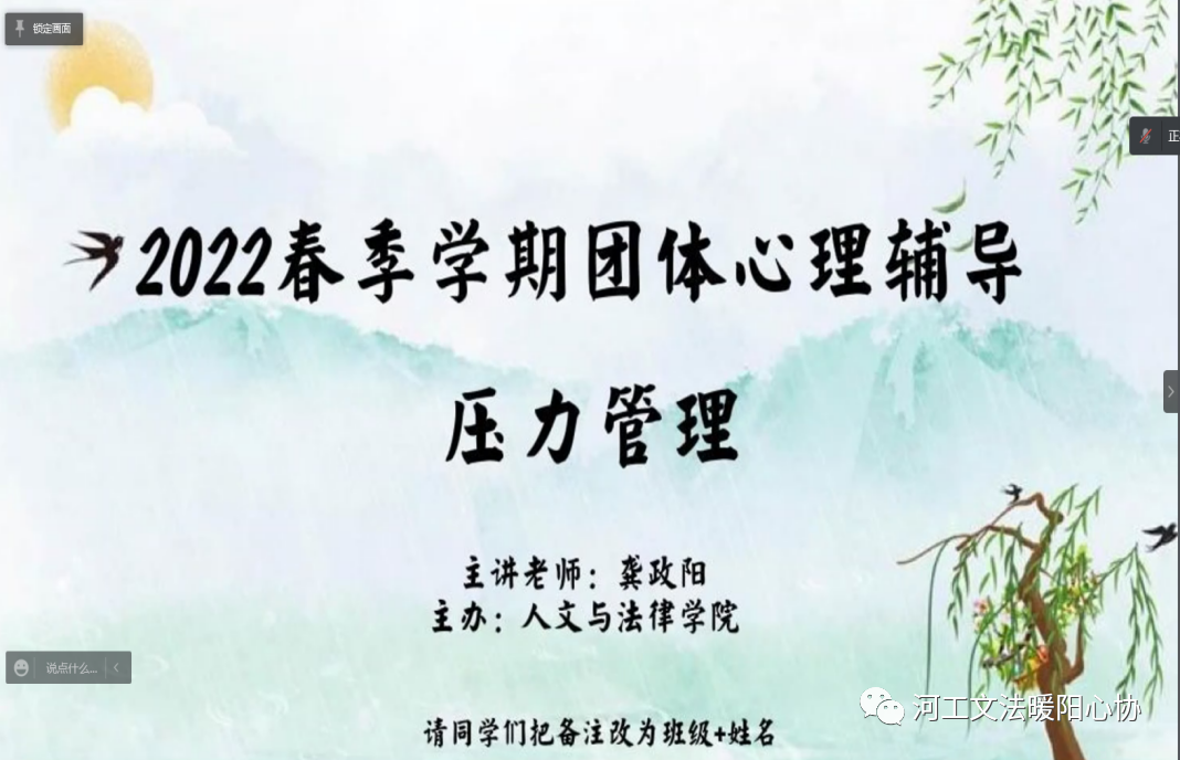 熟女 心向暖阳心理健康协会很荣幸邀请到了龚政阳老师为大家带来《压力管理》主题团体心理辅导讲座。熟女 心向暖阳心理健康协会全体成员及20、21级心理委员积极参会,认真聆听。整场讲座龚老师循循善诱,运用典型的现实例子、内容详实的PPT演示、充满趣味的视频动画让同学们了解和学会如何在学习生活中面对压力,进行压力管理。参会的同学们认真聆听、踊跃回答老师问题、与老师进行积极地互动,提出自己的看法和见解,讲座取得了良好的心理压力疏导效果。