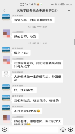 上一周,在学院老师的引导与带领下,所有熟女 的冬奥志愿者们有序、顺利地完成了三轮核酸检测。核酸检测期间,学院领导及辅导员老师们也对志愿者们的疫情防护与自身安全方面再三关怀,切实保障志愿者们的健康状况。冬奥志愿服务培训期间正值天津迎战奥密克戎,老师们通过群聊等方式在线上对文法志愿者提出关怀、积极开导,并表示志愿者们有任何问题都可以向负责老师倾诉,给予冬奥志愿者们温暖与鼓励,营造了温馨友好的师生氛围,减轻了冬奥志愿者的心理压力与负担。