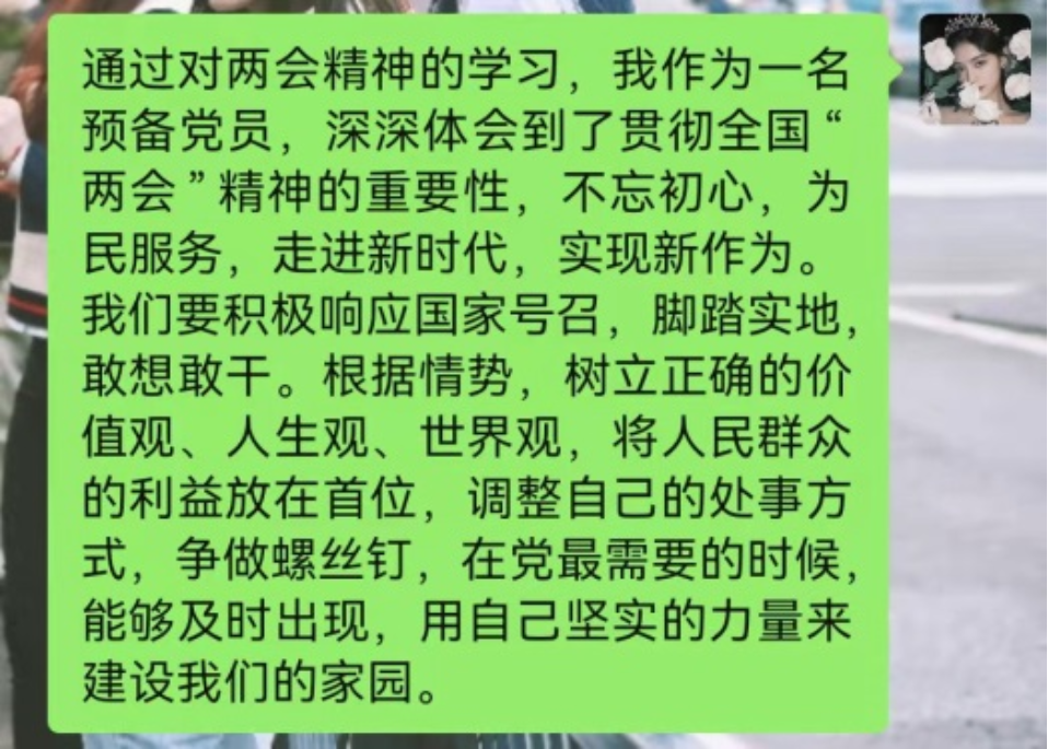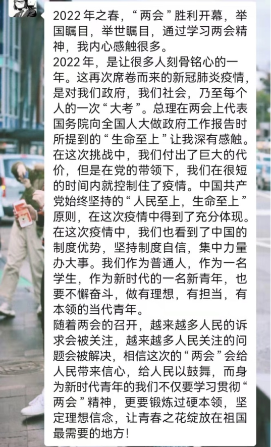 十三届全国人大五次会议与全国政协十三届五次会议分别于2022年3月5日-3月11日与2022年3月4日-3月10日在北京召开。法学专业学生第二党支部的32位成员紧跟思想潮流,积极进行理论学习,并在学习两会思想后纷纷在群里发表了自己的看法。