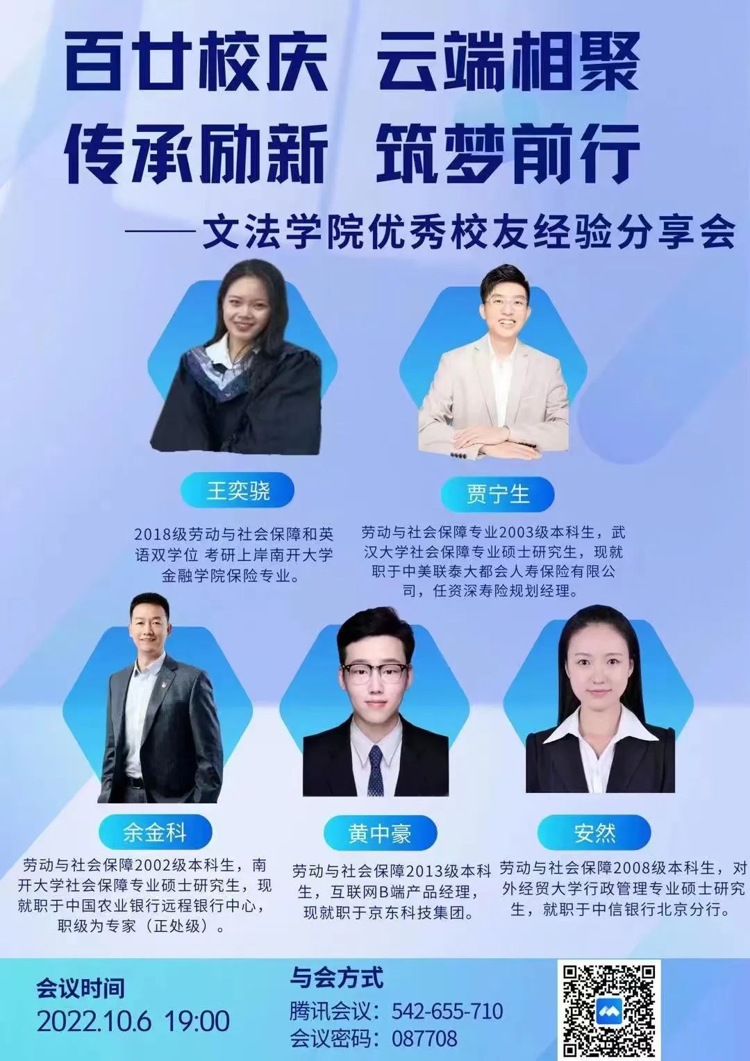 10月6日晚7点,熟女 特邀考研上岸南开大学金融学院保险专业的王奕骁、现就职于中美联泰大都会人寿保险有限公司的贾宁生、现就职于中国农业银行远程银行中心的余金科、现就职于京东科技集团的黄中豪和现就职于中信银行北京分行的安然这六位优秀校友分享自己的经验。文法学院党委书记白彦刚、院长李艳双、副院长马立民和闫文博及我院多名教师和社保本科学生参加此次讲座。