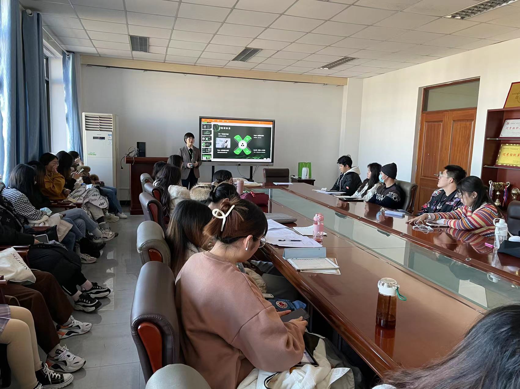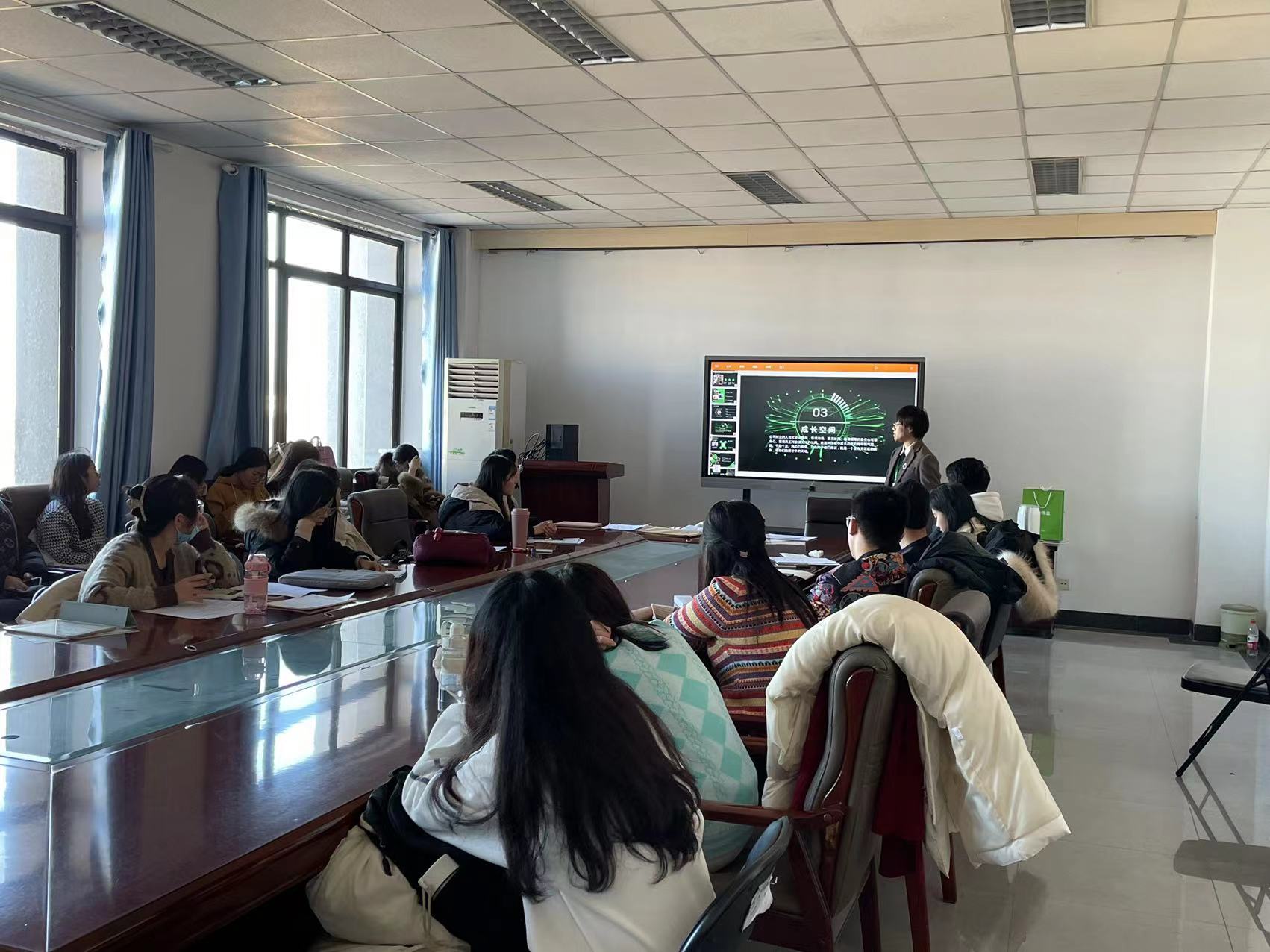 支部委员会结束后,基于即将毕业的同学们的求职意愿党支部书记王鑫同志邀请到了天地伟业的招聘经理进行企业宣讲会,并现场为同学们进行了面试培训和面试经验分享。
