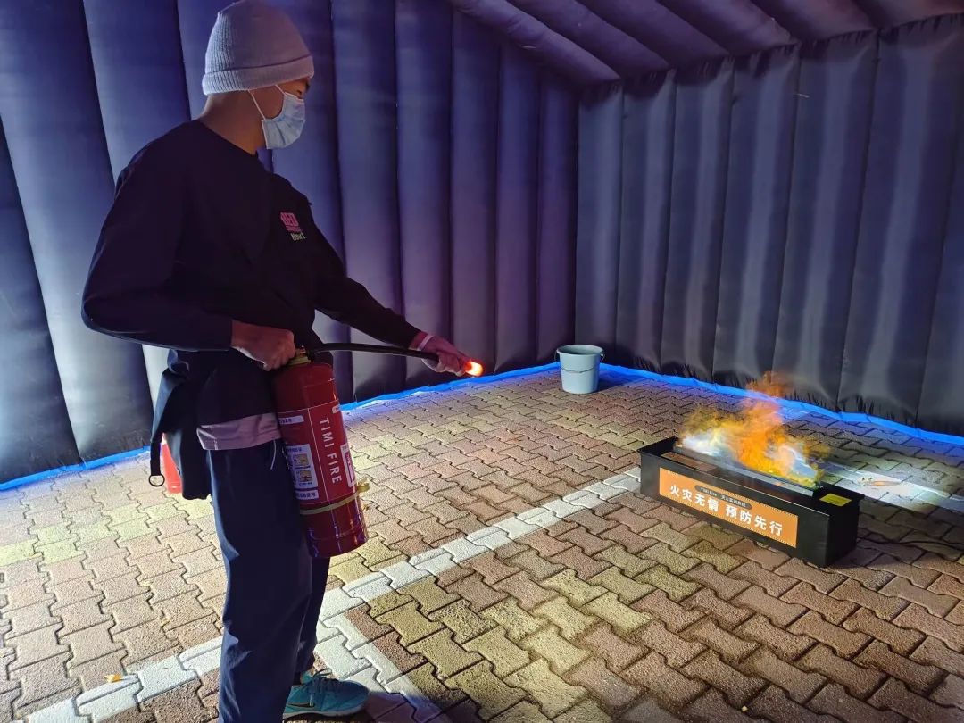 接下来便是现场的同学们体验灭火演练模拟仓和逃生演练模拟仓。在灭火演练模拟仓,同学们现场操作灭火器进行灭火;逃生演练模拟仓内喷射无毒无害烟雾模拟火场环境,同学们亲身体验火场昏暗且烟雾弥漫的环境。通过模拟仓内的学习演练,同学们对消防安全有了更深刻的理解。