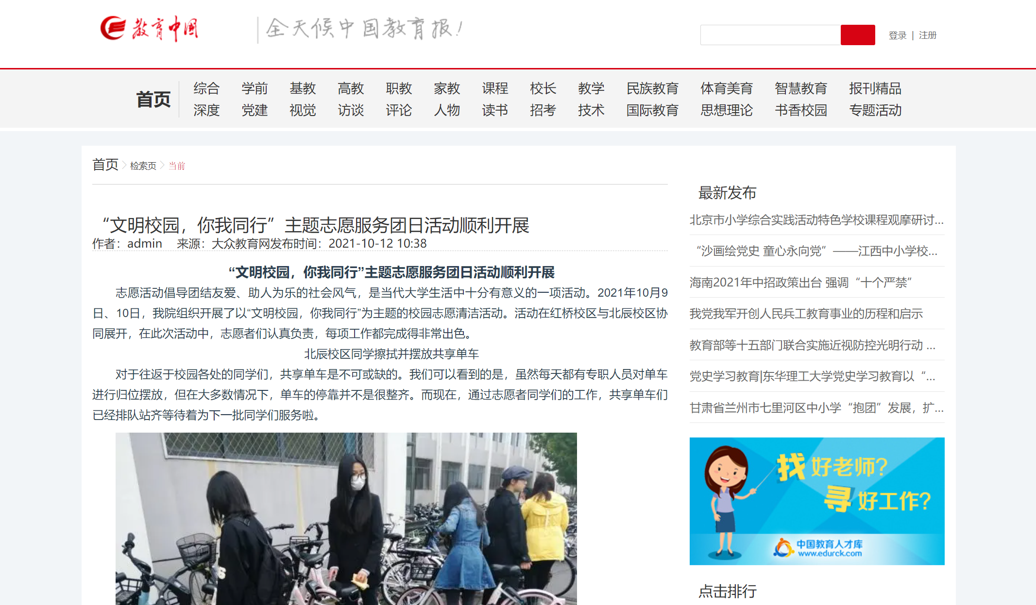 志愿活动倡导团结友爱、助人为乐的社会风气,是当代大学生活中十分有意义的一项活动。2021年10月9日、10日,我院组织开展了以“文明校园,你我同行”为主题的校园志愿清洁活动。活动在红桥校区与北辰校区协同展开,在此次活动中,志愿者们认真负责,每项工作都完成得非常出色。