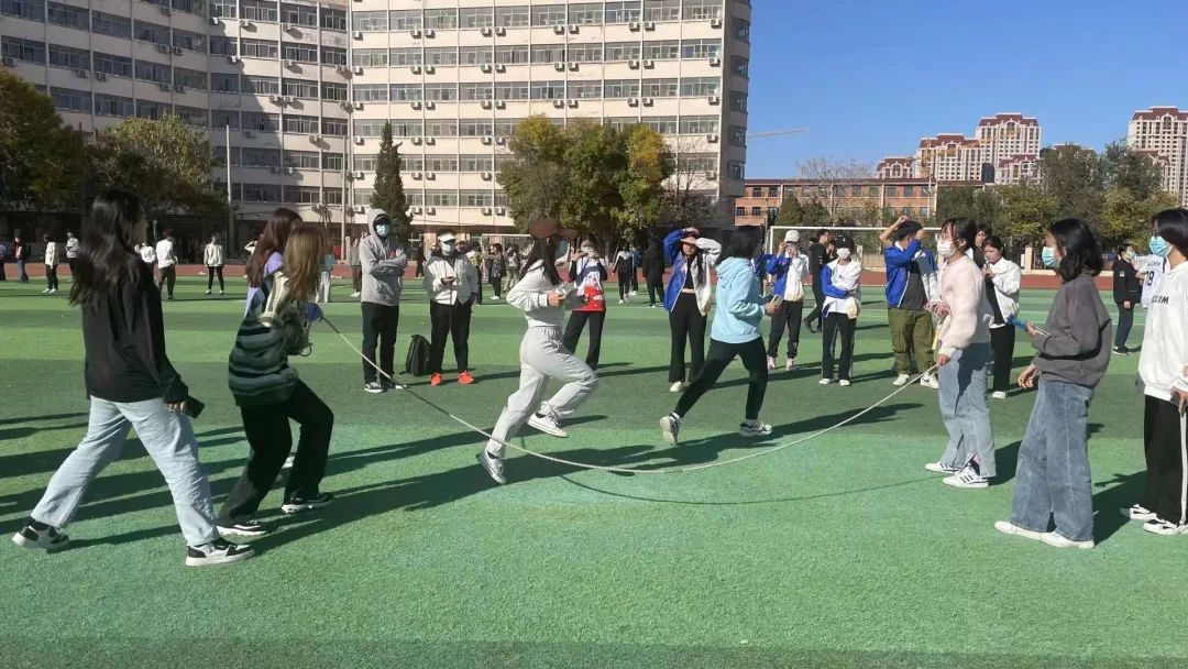 接下来同样激动人心的活动名为“循环发展”(又名“八字跳绳”)。参赛的同学们需两人摇绳,其余的同学便配合默契地一个个接力跳过,跳过的人数越多,得分越高。比赛开始,摇绳的同学抡圆了胳膊,铆足了力气将大跳绳摇得又圆又稳,跳绳的同学们也双眼紧盯落下来又摇上去的绳弧,绳子落下来的哒哒声与同学们的蹦跳声相互应和,像一首欢快的小进行曲。比赛终有输赢,但同学们从中获得的欢乐和关于如何迎接挑战的启示却更让人受益匪浅。