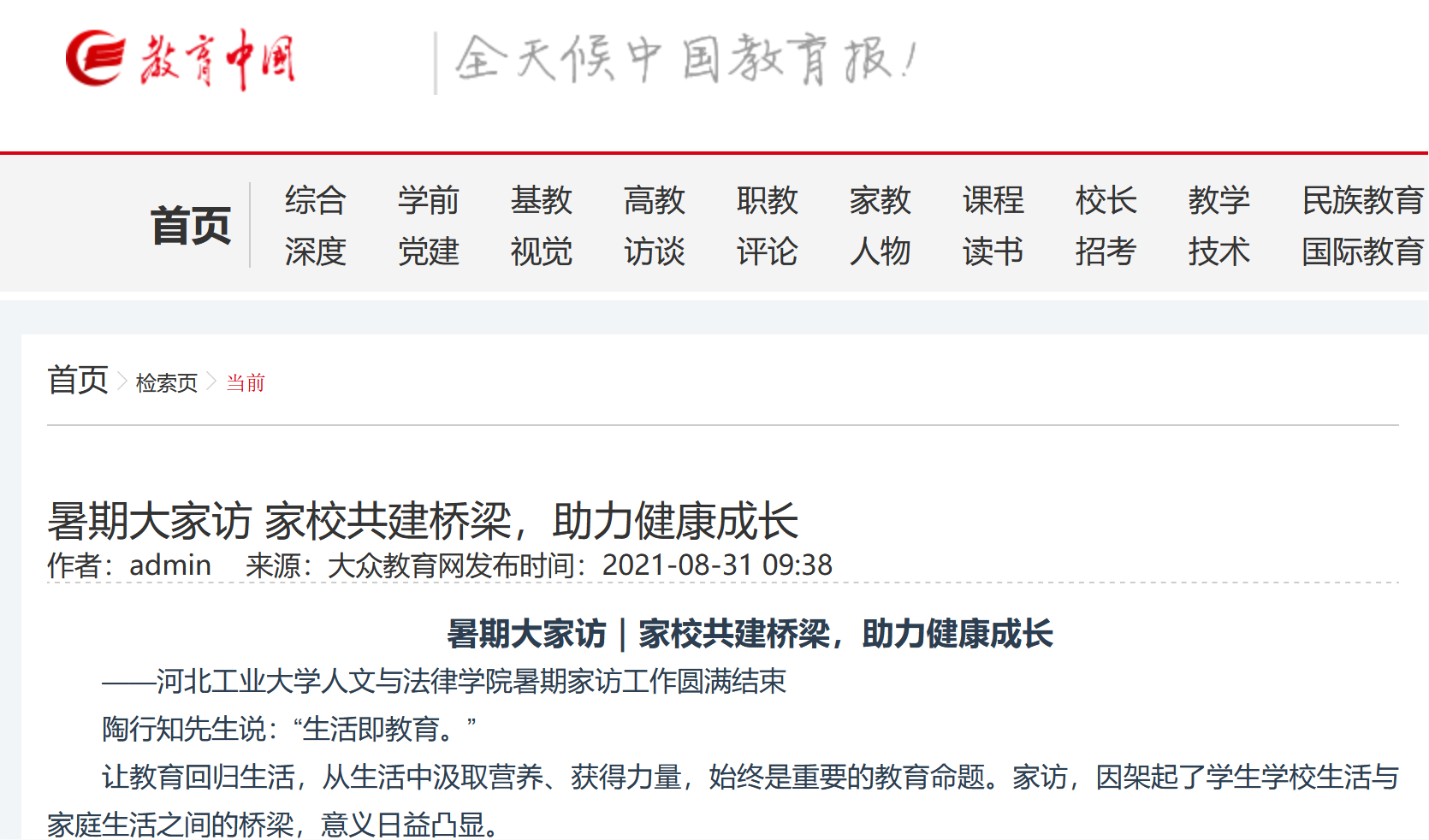 教育中国网发表《暑期大家访|家校共建桥梁,助力健康成长》