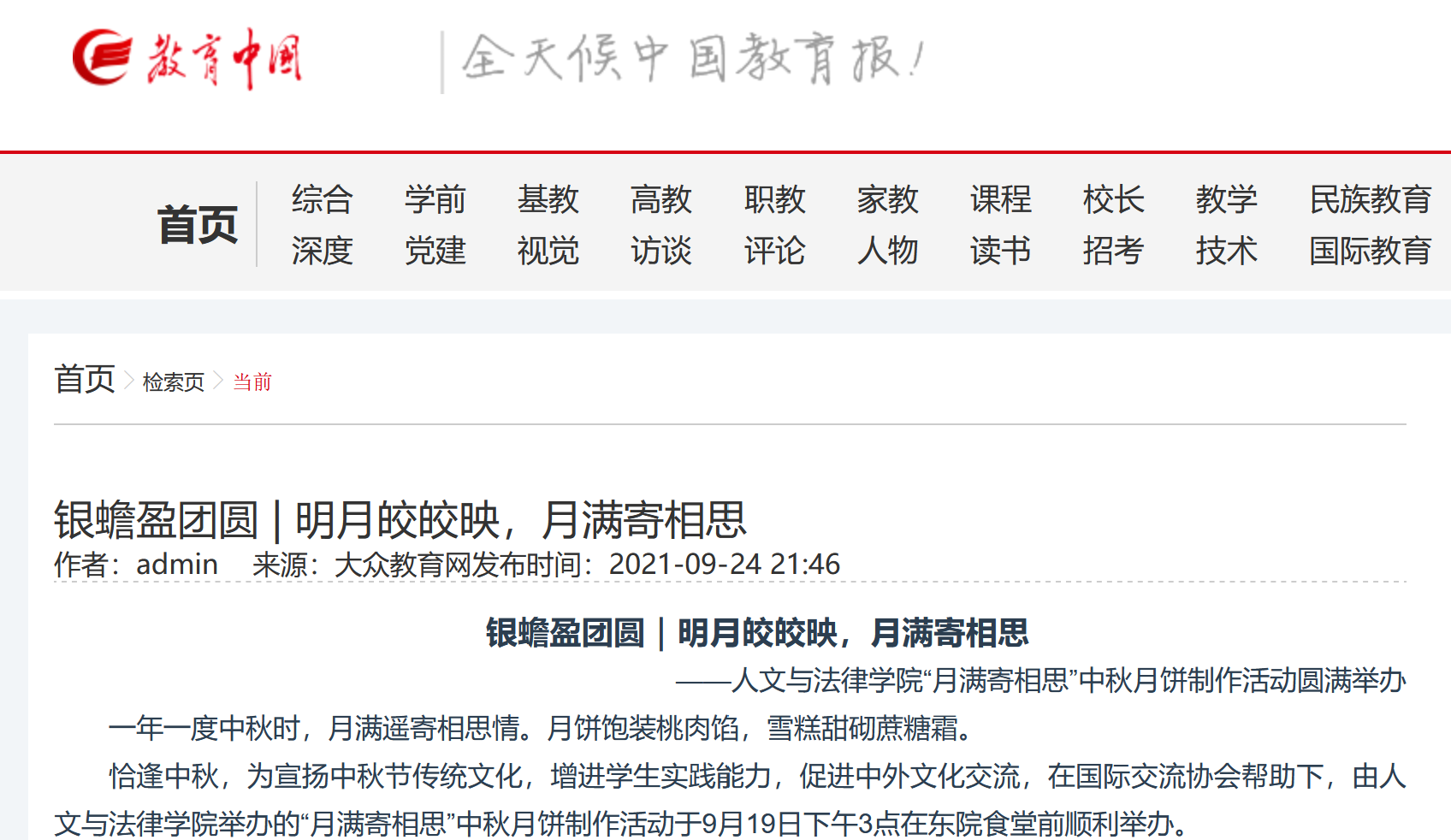 教育中国网发表《银蟾盈团圆|明月皎皎映,月满寄相思》
