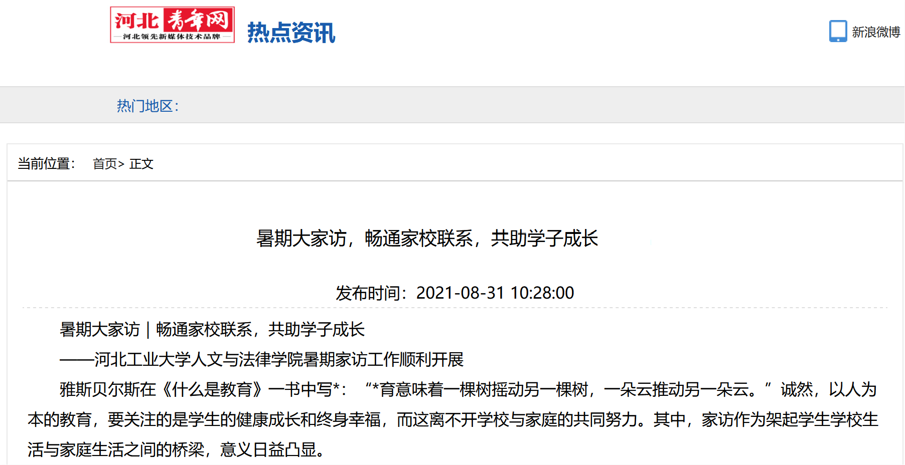 河北青年网发表《暑期大家访|畅通家校联系,共助学子成长》