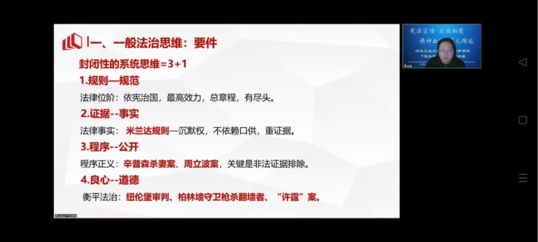 然后是蒋冰晶老师为我们讲解。蒋老师从法治思维入手,讲述了科学立法、严格执法、公正司法、全民守法的要求。接着蒋老师为我们讲述了许多关于法治思维的故事,如苏格拉底的故事中体现的以身守法、大宪章事件中约束公权的内容、红磨坊故事中关于人人平等以及公正司法的内容、纽伦堡审判中关于科学立法方面恶法非法的讲述、柏林墙守卫枪击案中严格执法中执法为民思想的体现……随后蒋老师向我们讲述了一般思维中的要件即规范与规则、证据与事实、程序与公开、良心与道德,这些法律要件成为了系统性法治思维的必不缺少的部分。