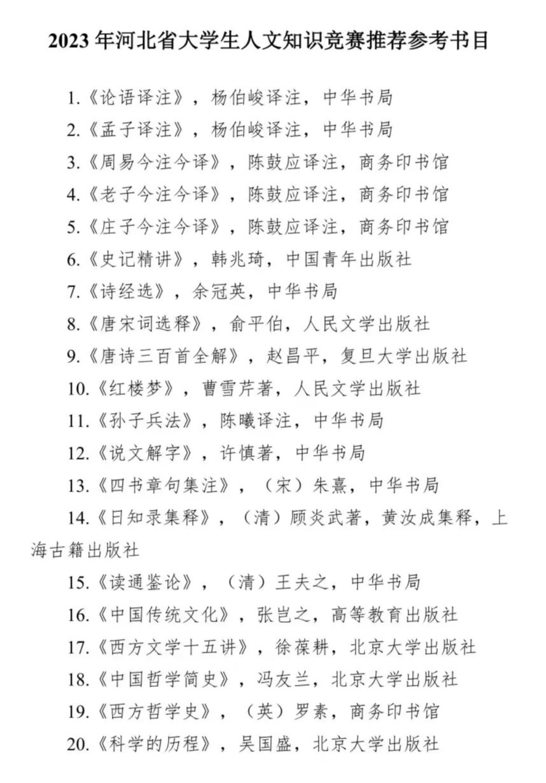 (三)组委会发布《2023年河北省大学生人文知识竞赛推荐参考书目》(见附件),为竞赛提供必要的参考资料与共同的知识框架。