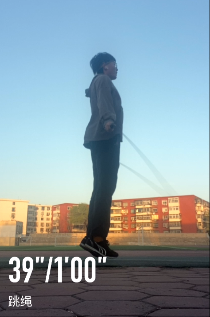 跳绳:双脚起跳,跳绳自双脚下沿身体额状轴旋转360度为一周算一个,计一分钟内完成次数。视频中一个个跳跃的身影,跳跃出青春的活力,展现出文法学子的魅力与昂扬向上的精神。