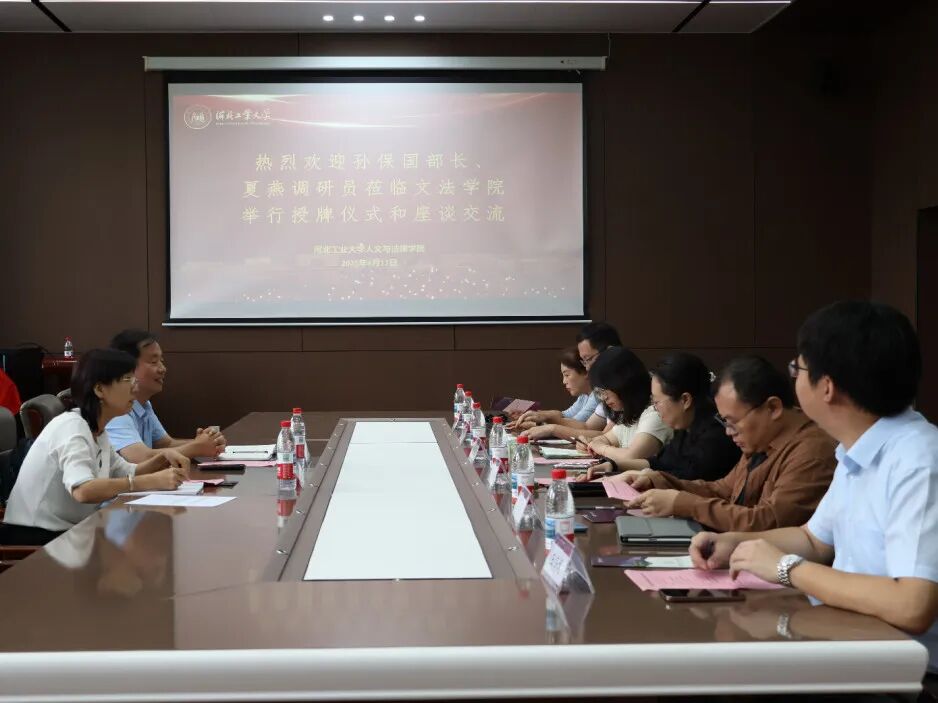 2025年9月17日上午,河北省贸促会法律部孙保国部长、夏燕调研员莅临熟女 文法学院举行河北涉外商事法律服务联盟联合发起单位授牌仪式和座谈交流会。文法学院党委书记于慧,院长蒋冰晶,党委副书记、副院长常萌,国际法学科带头人石小娟,法学系党支部书记李飞,法学系主任王海龙出席本次会议。本次会议由王海龙主持。