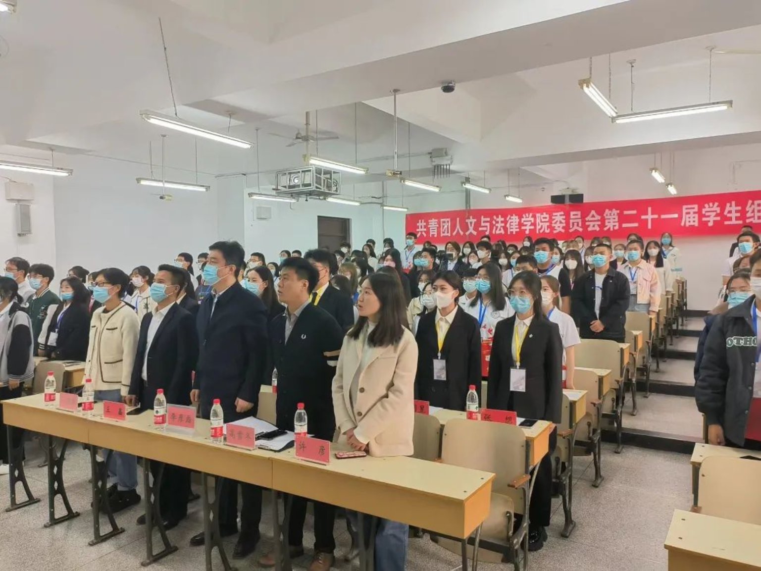 同学们身着会服到达会场。在会议开始前,全体成员在七教阶梯前合影留念,一个个青春洋溢的笑脸定格在画面中。随着嘹亮的《义勇军进行曲》响起,与会人员唱起国歌,心中的信念也愈发坚定。